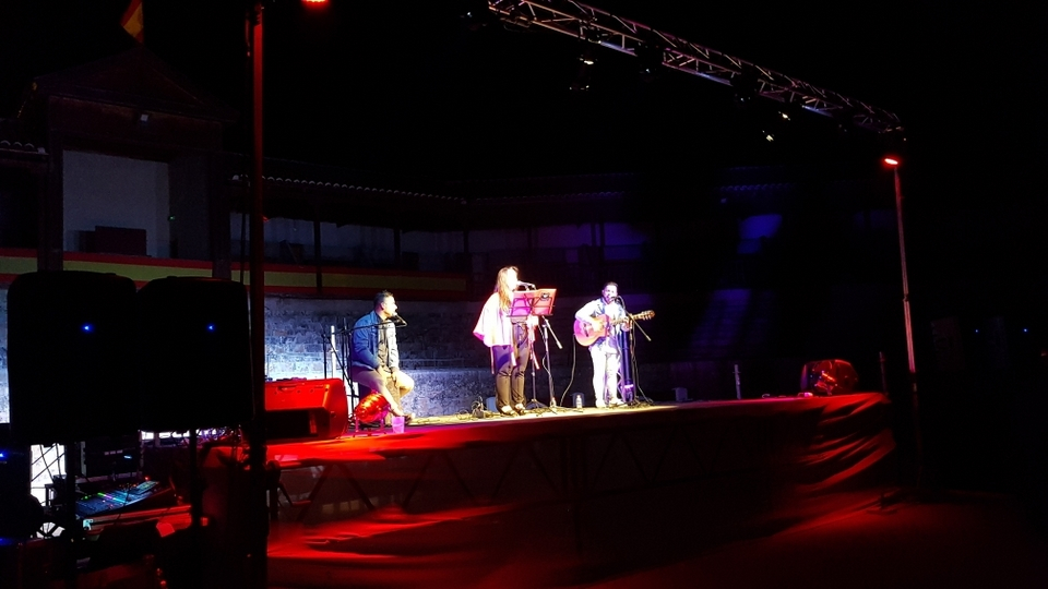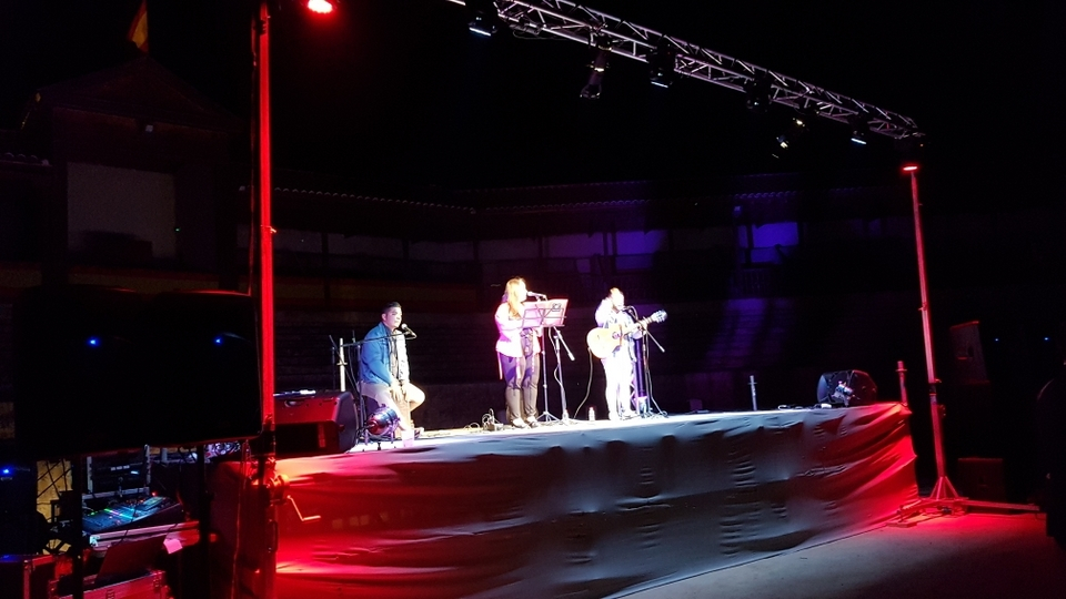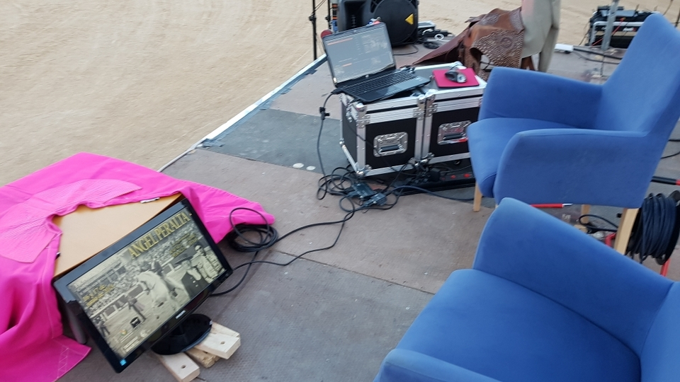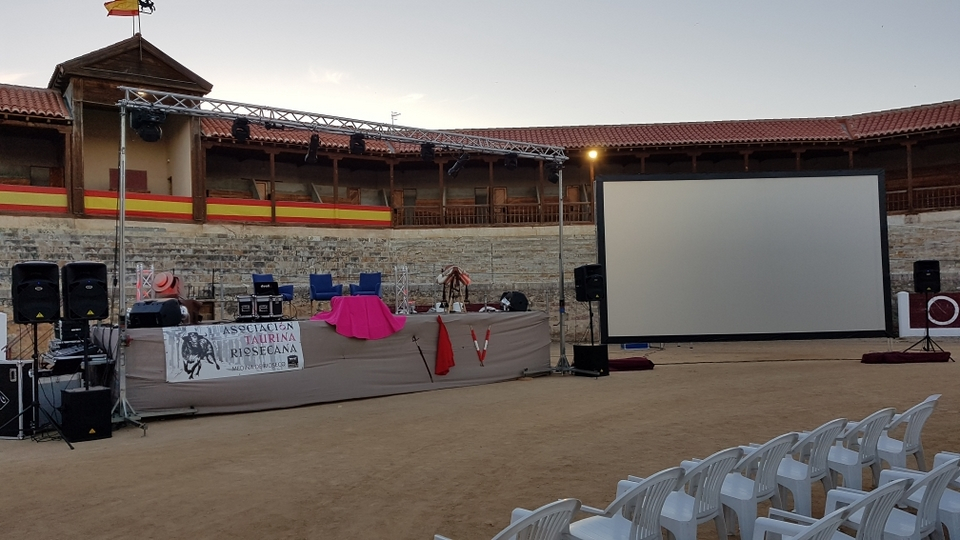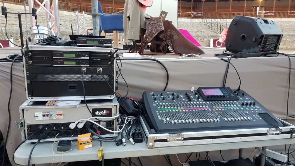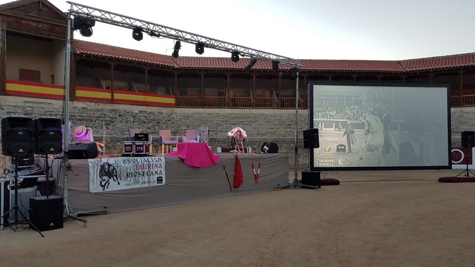 Para la realización del Homenaje usamos dos sistema de altavoces Behringer 815Neo junto con los Subgraves 1500D Pro de la misma marca y un punto aislado de sonido con la serie 912 para intentar dispersar de la mejor forma el sonido debido a las dimensiones de la plaza, tres líneas de monitores de sonido independientes y una línea de monitor de vídeo para disfrutar las proyecciones de nuestra pantalla gigante desde el escenario, todo ello manejado a través de varios sistemas de Kramer Electronics. Un puente de 10 metros con iluminación Led y recortes ajustados con programación Chamsys para vestir el escenario y microfonía Shure y Sennheisser para completar el montaje. Un montaje digno del homenaje a los que fueron los más grandes en el mundo taurino en Medina de Rioseco. (Fotos del acto: Fernando Fradejas).