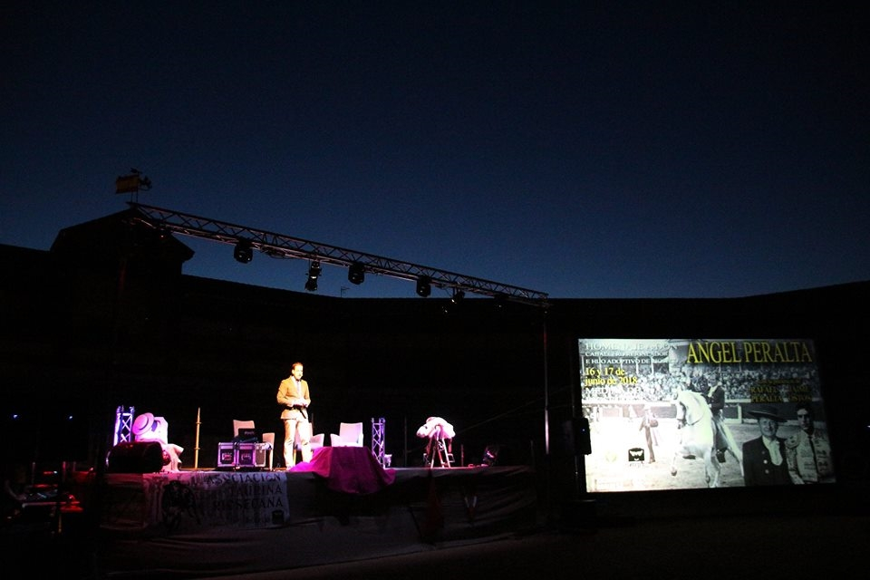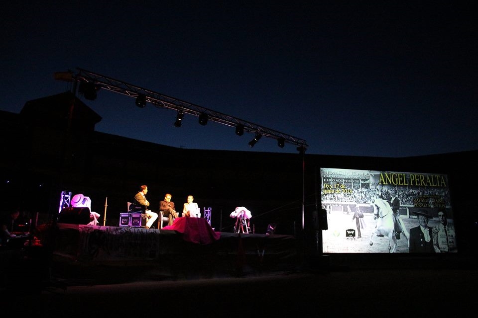Por la noche, el Coso del Carmen acogió un emocionante espectáculo en el que participaron el rejonador Rafael Peralta y el torero Jaime Ostos, en un acto conducido por el periodista riosecano José Ángel Gallego. A través de audiovisuales y de los propios testimonios de los toreros se recorrió toda la prolija carrera profesional de Ángel Peralta, desde su debut en la plaza de la Pañoleta en 1945 hasta su homenaje en 1992 en la Plaza de las Ventas.